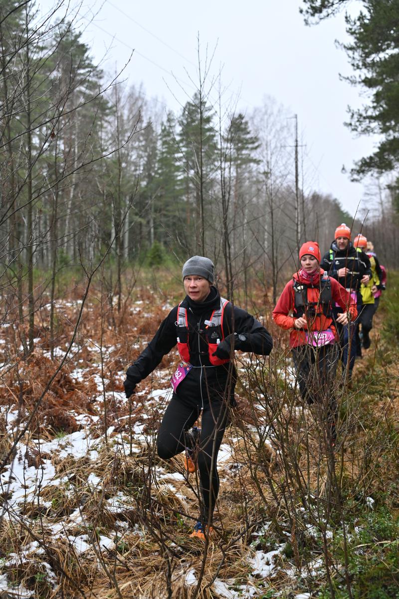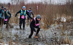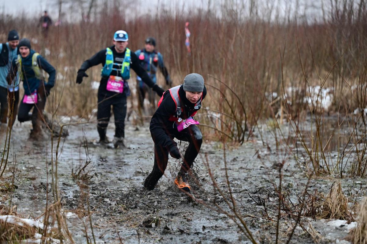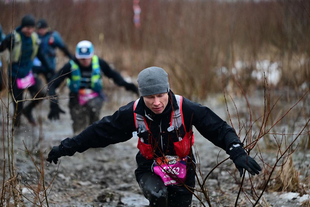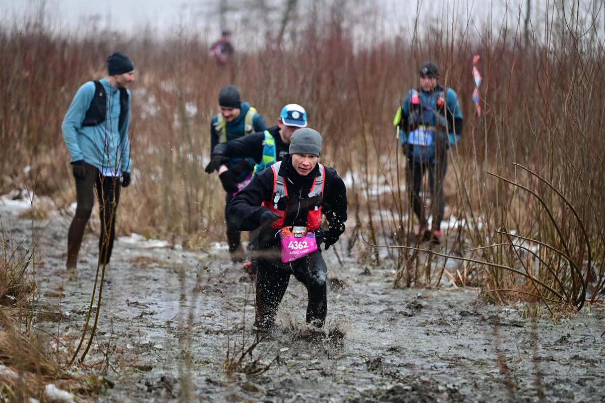 По краю вспаханного поля, где меньше жидкой грязи, поднимаюсь в деревню. Дальше полтора километра относительно ровно и твердо. Снова стараюсь себя подгонять, не столько, чтобы отыграть позиции, сколько, чтобы не потерять то, что удалось выиграть раньше. Перехожу через дорогу, а там - снова пашня! Только теперь замерзшая, с большими ухабами - лучшее место, чтобы переломать ноги. В голове противоречивые мысли. С одной стороны, я уже устал от трейла, с другой - это очередная возможность, чтобы отыграть позиции. Снова глаза в землю и прыг-скок с кочки на кочку. Догоняю двоих ребят с К40. Один отходит в сторону, чтобы пропустить меня, и я вижу отчаяние в его глазах. Такое живое!
