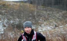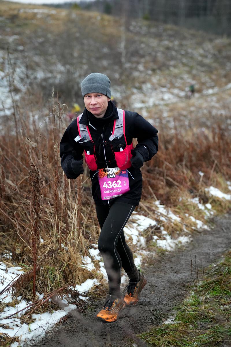 Наконец, стартуем! Учитывая погоду, я ожидал, что начало побежим по чистому асфальту. Но нет, здесь оказалась грязная обледенелая дорога. Однако кроссовки держат. Покрытие позволяет бежать 4:15-4:20. Стараюсь не напрягаться, но бегу довольно быстро, чтобы занять хорошую позицию перед тропой. Алексей сначала как-то замешкал и остался позади меня.